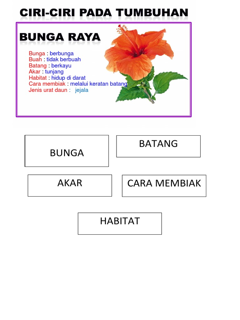 Bunga kebangsaan kita Malaysia. Berwarna merah tanpa bau dengan 5 kelopak. Dokumen Standard Kurikulum Dan Pentaksiran DSKP Sains Tahun 6.